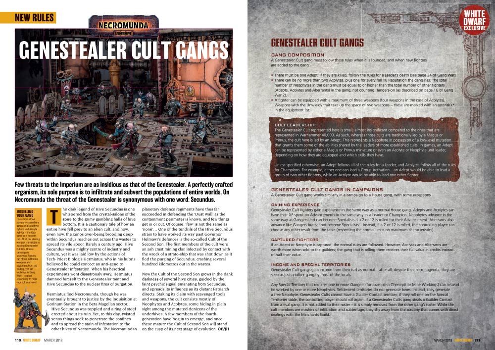 Volviendo a una buena y vieja tradición, la WD de este mes trae consigo las reglas para una nueva facción de Necromunda. En este caso, los Cultos Genestealer, que como se anunció hace tiempo tienen así sus reglas para luchar en la sub-colmena.