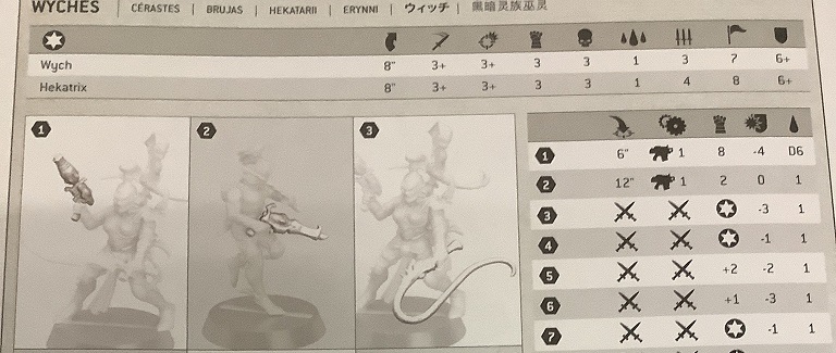 Veamos el nuevo perfil de las Brujas, con un Ataque más, y la mejora en la FP de varias de sus armas, todo ello gracias a la imagen que circula por uno de los grupos Drukhari de Facebook.