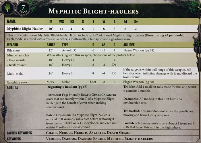Una de las unidades sorpresa que nadie esperaba en la Guardia de la Muerte son estos pequeños y nuevos Ingenios Demoníacos llamados Myphitic Blight Hauler (y que podríamos traducir como Transportistas de Plaga Mefíticos pero casi mejor los llamaremos Mefíticos a secas). Ya podemos ver su hoja de datos completa.