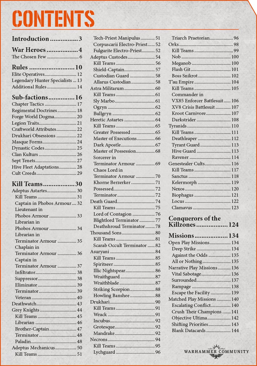 El suplemento Kill Team Élites trae consigo una larga lista de nuevas miniaturas usables para todas las facciones, además de reglas de sub-facciones.