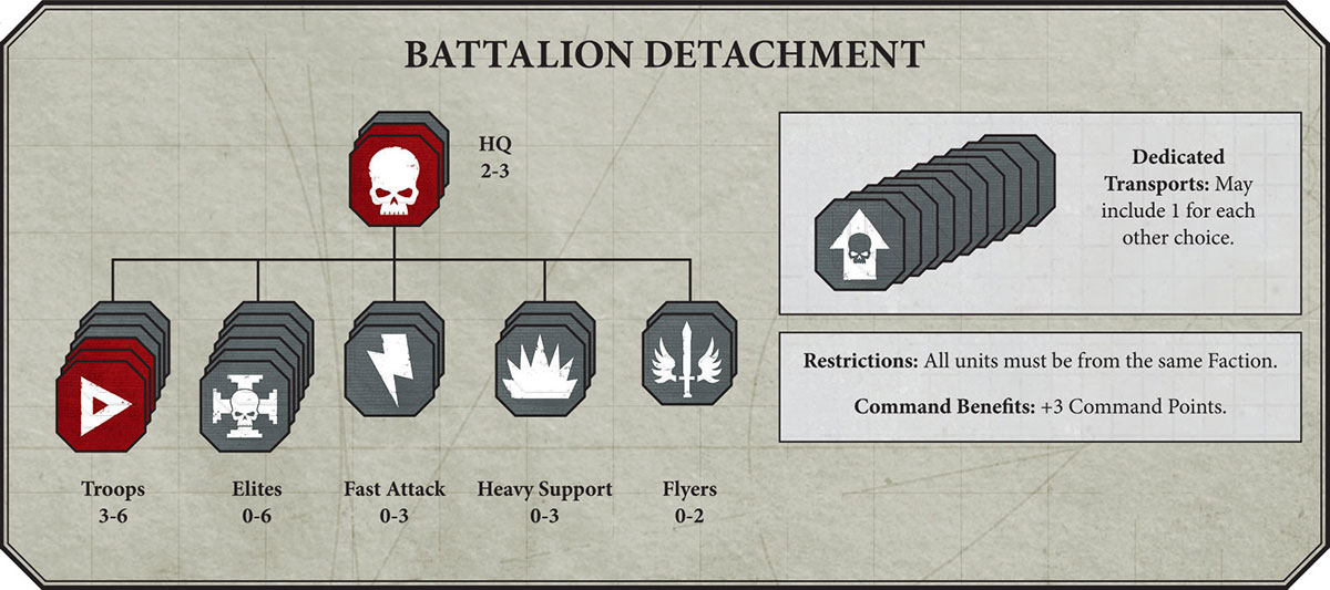 Los destacamentos están compuestos por una combinación de 9 tipos de unidades, muy similares a los de toda la vida de Warhammer 40.000. Algunos reconocerán las marcas de las compañías de Marines Espaciales y el clásico Armas Combinadas, junto a los también clásicos Señor de la Guerra, Fortificaciones y uno nuevo: Voladores, que tiene su propio tipo de unidad de organización de ejército.