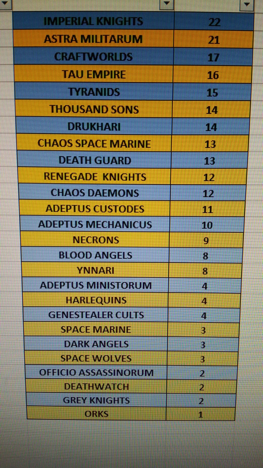 Y ahora algunas estadísticas interesantes. Veamos las facciones de los destacamentos usados por los 156 participantes: