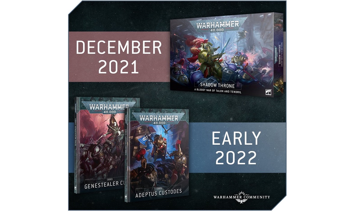 La caja Shadow Throne que incluye los dos nuevos personajes y más miniaturas se mantiene planificada para diciembre. Sin embargo, los esperados Codex: Cultos Genestealer y Codex: Adeptus Custodes se retrasan hasta el inicio de 2022.