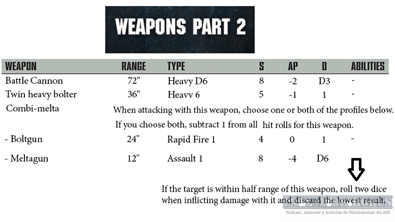 De paso, podemos descubrir por fin el perfil de la fusión. El alcance 12″ se mantiene, y sigue siendo Asalto 1 con F8. La FP es un -4 (anulando las armaduras 3+ por completo) y el Daño es 1d6, como el cañón láser. Pero además, a mitad de su alcance permite tirar 2d6 de daño y elegir el valor más alto. No habíamos visto venir esta posibilidad para los daños, y es una buena forma de escalarlos para conseguir que la fusión sea mejor que el láser a corto alcance, pero no tan bestia como sería tirar 2d6 de daño:
