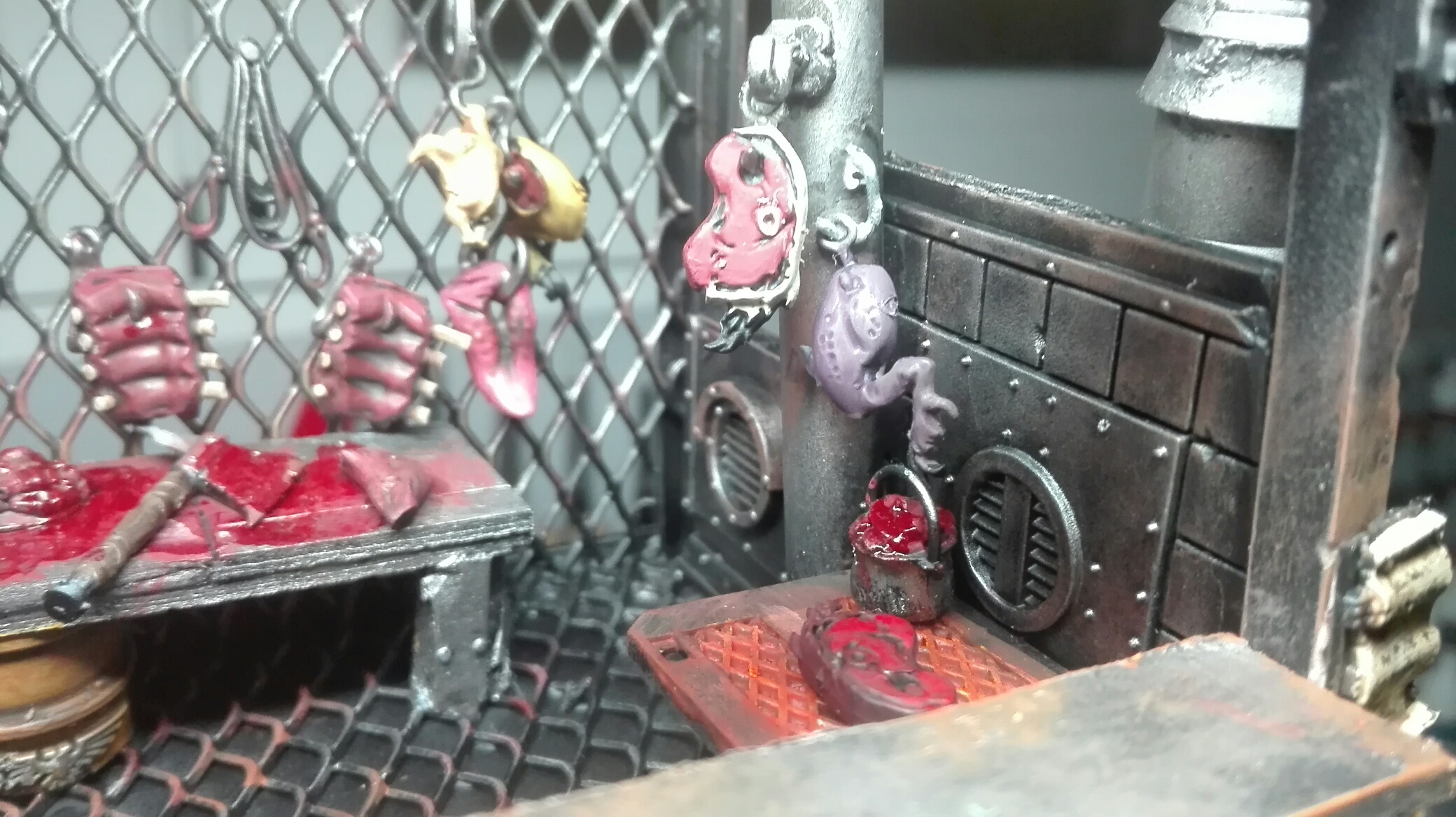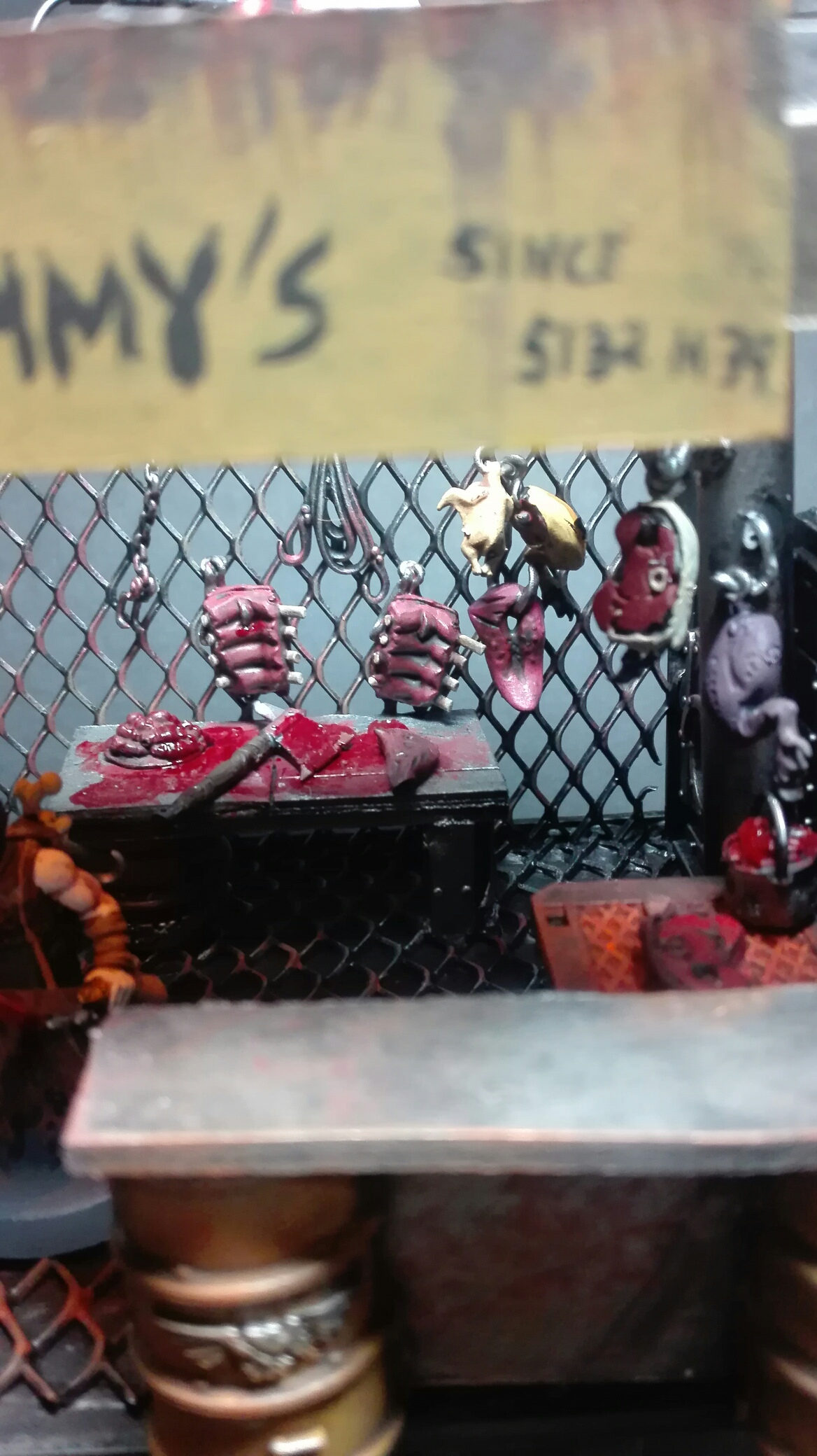 Empecé a hurgar por las cajas de restos que guardé en su día de Reinos Ogros entre otros y me percaté que tenía carne suficiente para montar una carnicería… luego me entró hambre y la idea surgió ¡Hace falta un asador!