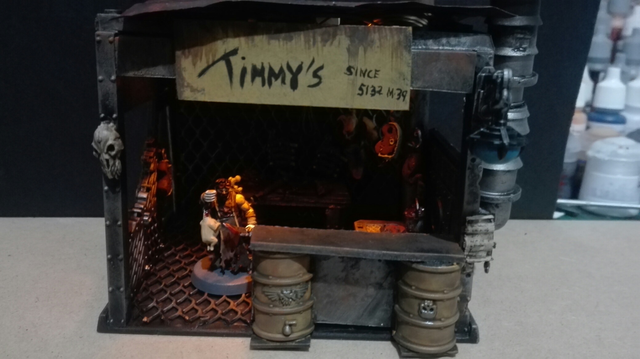 ¿Y por qué Timmy’s? Si recordáis la primera misión de Juegos de Estrategia del año pasado era salvar al Lord Almirante Timotheu van der Ville que quedó aislado rodeado de poxwalkers y un grupo de aguerridos vostroyanos iban a rescatarlo… El Lord Almirante fue degradado y expulsado con deshonor por su despiste y tras casi dos años de ese incidente se encontró con una pensión mínima a las afueras del Segmentum Solar en Necromunda. Medio arruinado decidió abrir un local, pero solo le alcanzó para los barrios bajos.