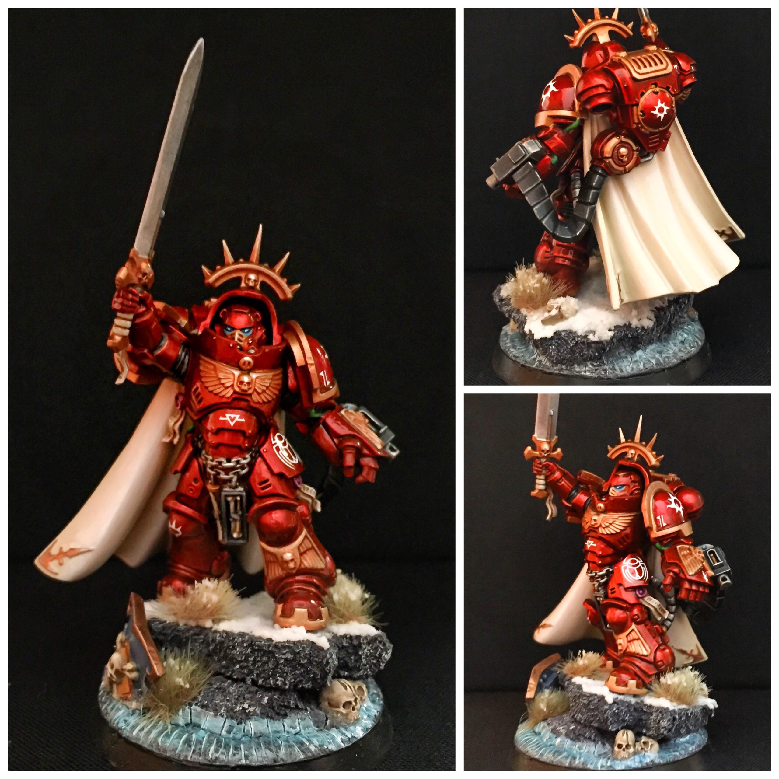 Nos explica Quique (al que podéis seguir en su instagram) que lo pintó como regalo de cumpleaños para un amigo que colecciona un ejército de NO-Mil Hijos (se enamoró de las miniaturas y el esquema de color pero es leal hasta la médula al Emperador). Entre Quique y su amigo han definido un buen trasfondo para el Capitán Tadeus y sus Exarcas Solares: