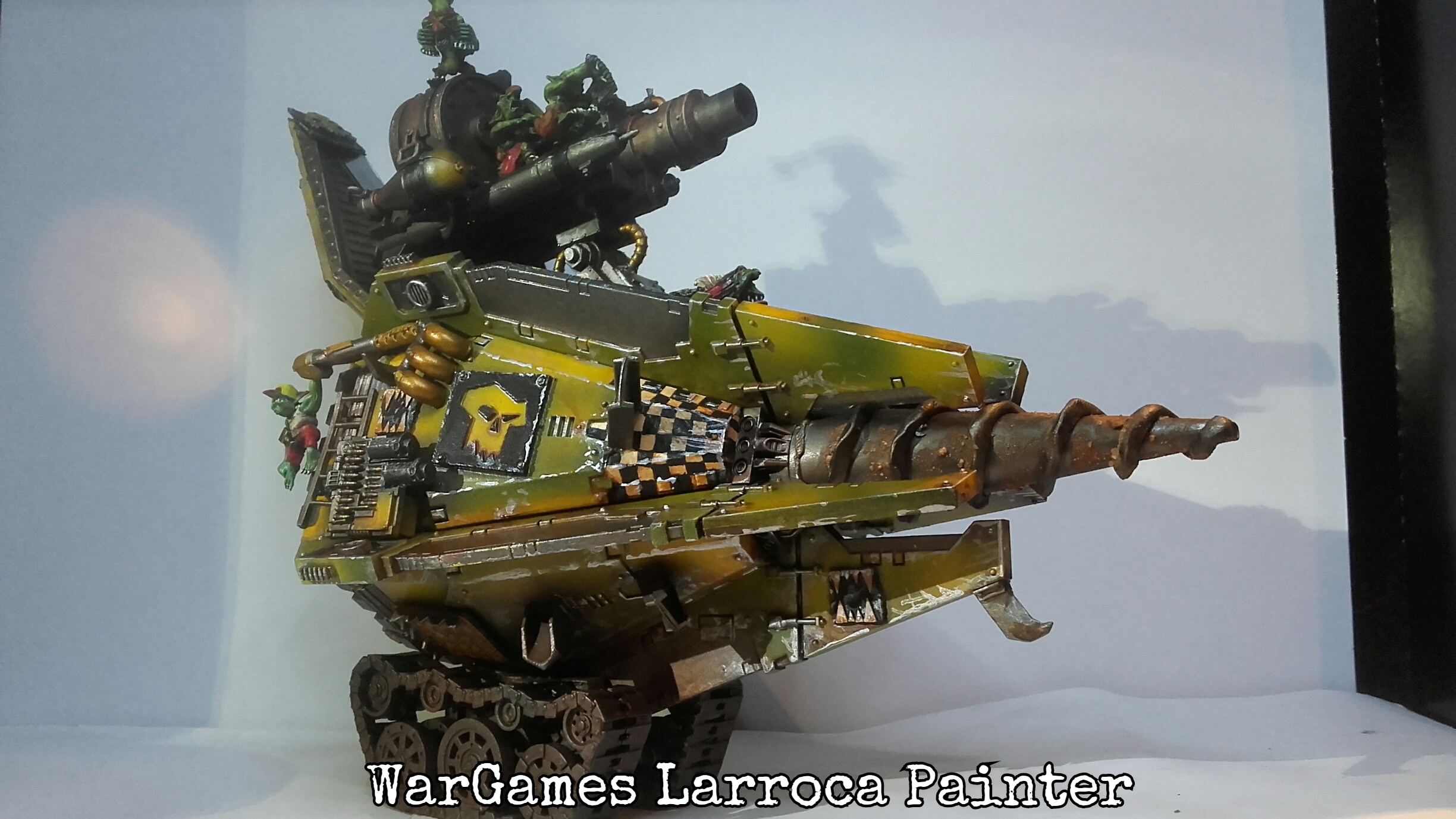 El proceso de construcción, del que no hice fotos, es sencillo, una cápsula, orugas de battle wagon, restos de Stompa, piloto de Big Stompa, un montón de gretchins y el taladro en sí es un molde de repostería al que le modelé la rosca con masilla.