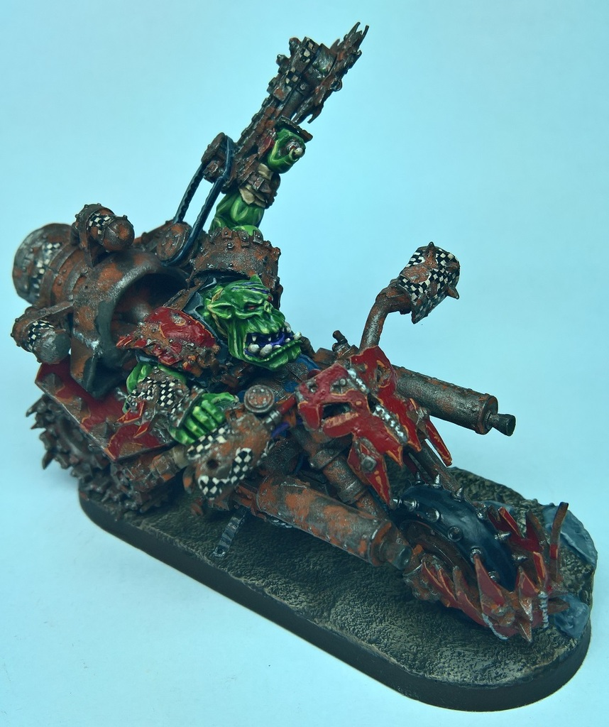 Como habéis podido leer, aquí ya estaba yo maquinando su siguiente paso. Eso es porque ya tenía pensado hacerme con la impresionante miniatura del kaudillo en moto de forgeworld. Pero claro, las cosas de forgeworld se han de comprar meditadamente, que son caras a más no poder. Así que fue pasando el tiempo hasta que por fin me hice con ella. Así que aquí os presento por fin la verdadera miniatura de la semana. Este trasfondo lo escribí al inicio de la campaña de Gathering Storm, espero que os guste tanto el trasfondo como la figura.