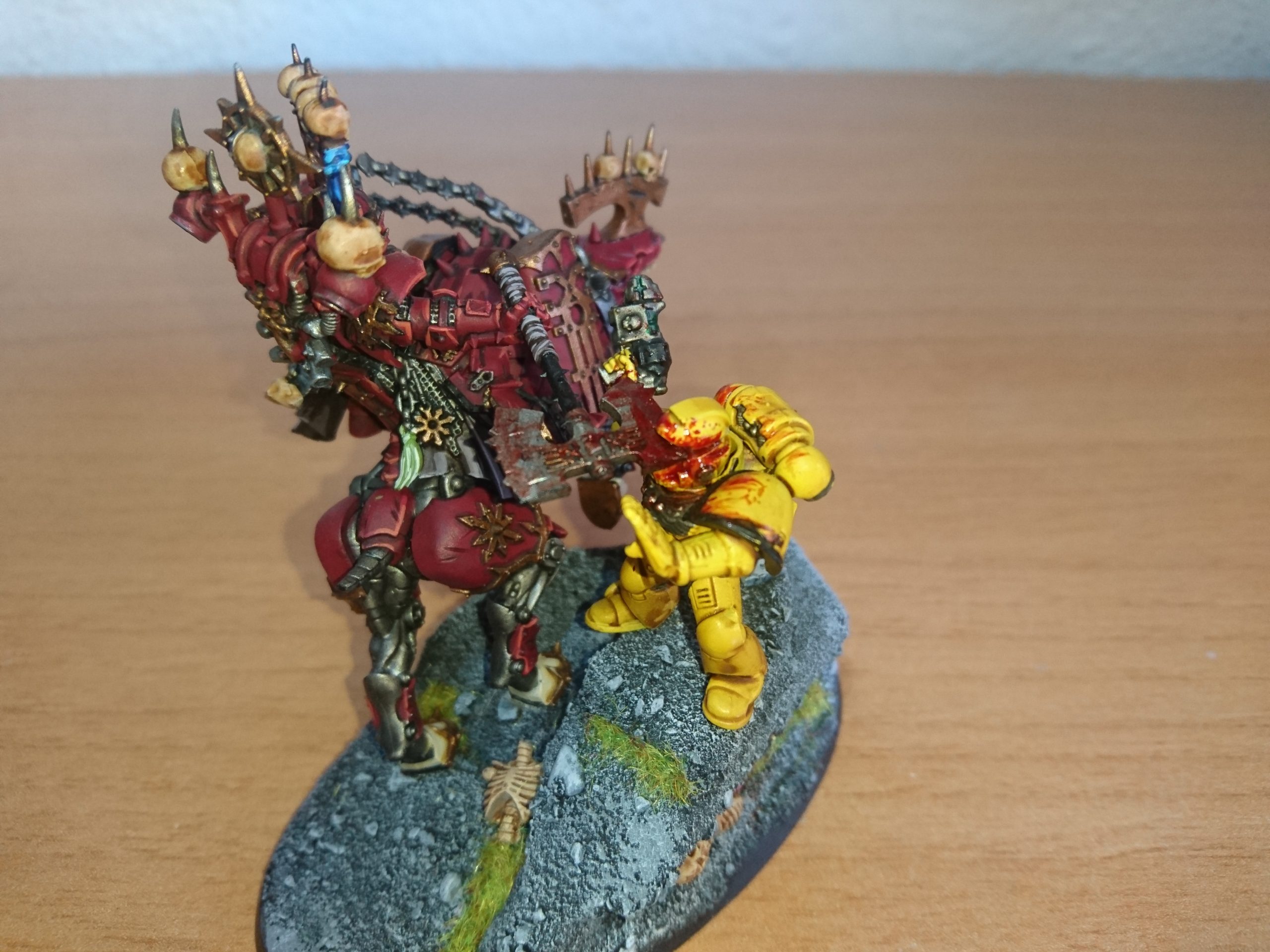 Los restos de sangre están hechos con el color blood for the blood god, la peana del juggernaut esta hecha con corcho, arena de playa y pintada del gris dawnstone la primera capa y luego un pincel seco del mismo color mezclado con blanco. Las miniaturas están ancladas y pegadas con alambres y la peana esta rematada con césped electrostático.