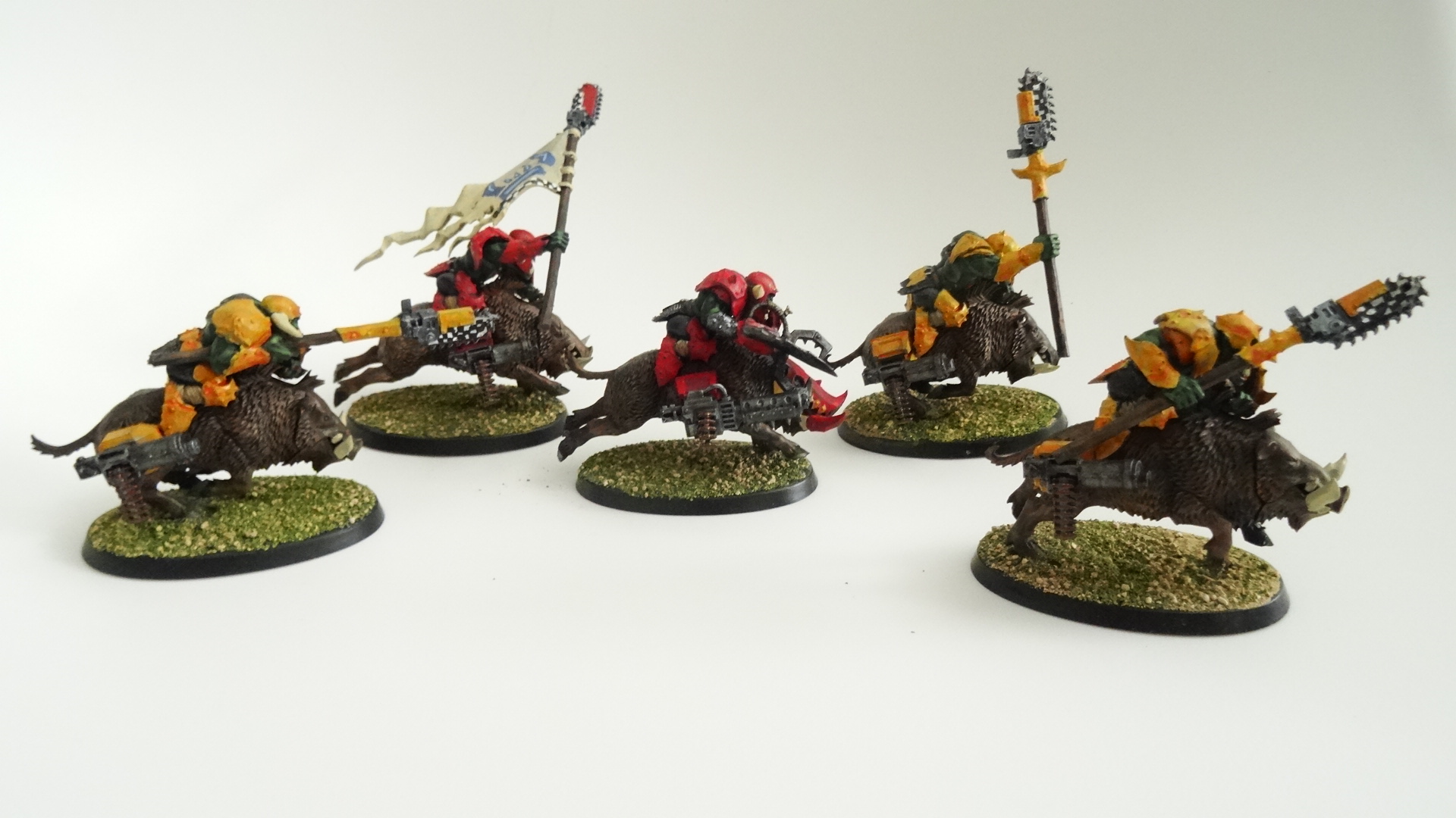 Con los jinetez de jabalí no podía hacer otra cosa que representar unos motoriztas orkos. La conversión bastante sencilla pero resultona, sustituir la punta de la lanza por rebanadoras y “akoplar” unos akribilladores a los jabalíes y listo.