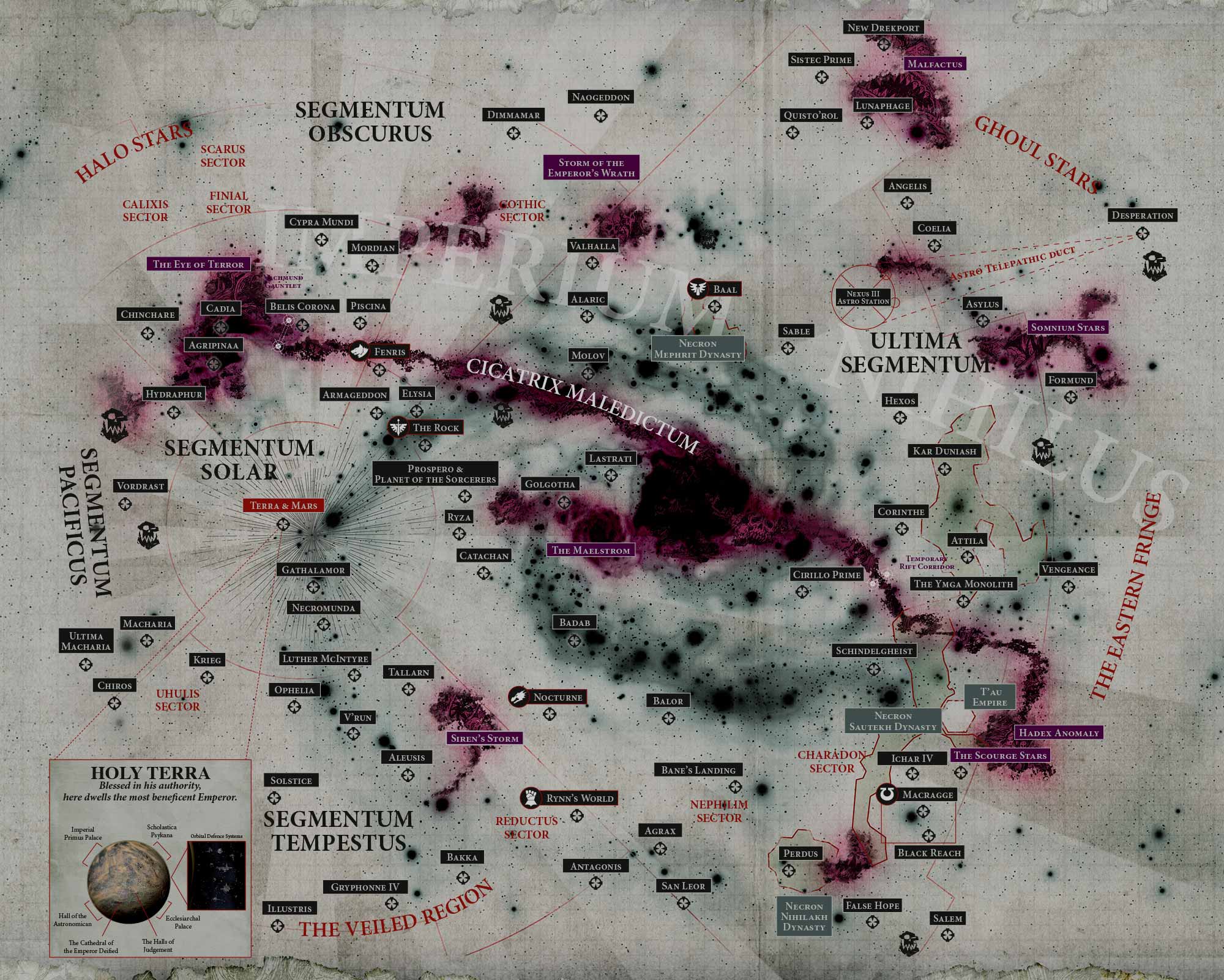 Mientras Terra todavía aguanta en el corazón del Segmentum Solar, y gran parte de la galaxia se mantiene como siempre, hay también algunas otras novedades en el mapa. En un primer vistazo se puede ver el Planeta de los Hechiceros, un imperio Necrón en crecimiento en el este galáctico y nuevas tormentas de disformidad en cada segmentum.