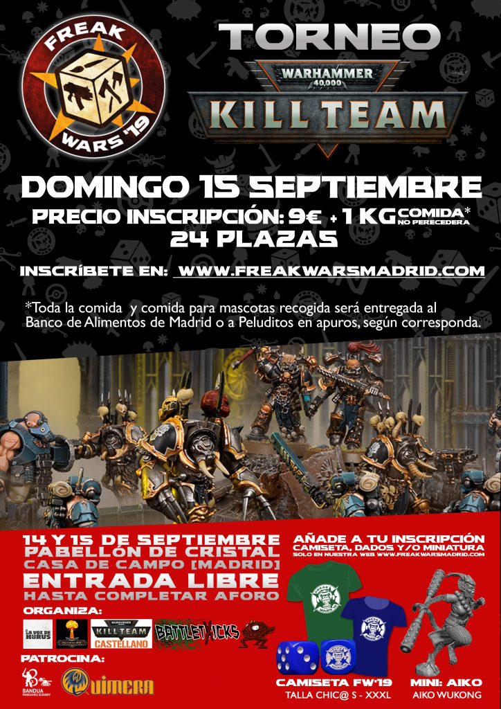 Junto a los compañeros de Kill Team Castellano, DiesIrae40k y Battletricks organizaremos el 15 de septiembre el primer torneo de Kill Team de las Freak Wars. 24 plazas y enmarcado en un evento del prestigio y la calidad que tiene Freak Wars.