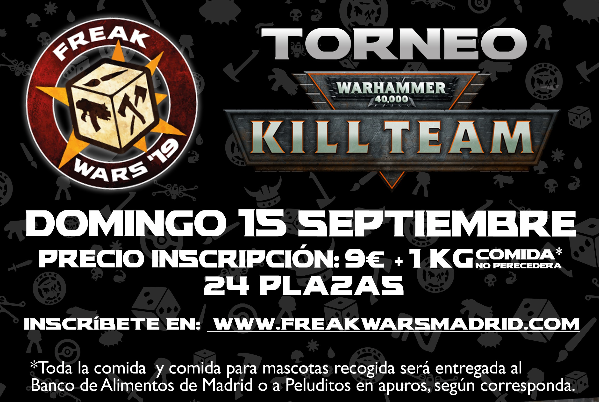 Junto a los compañeros de Kill Team Castellano, DiesIrae40k y Battletricks organizaremos el 15 de septiembre el primer torneo de Kill Team de las Freak Wars. 24 plazas y enmarcado en un evento del prestigio y la calidad que tiene Freak Wars.