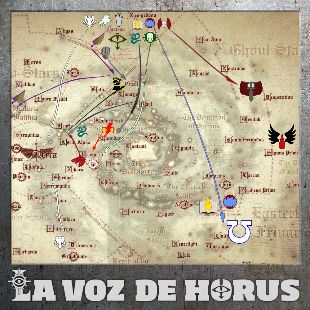 Recordad que aquí están los mapas que hemos elaborado como apoyo visual para seguir esta segunda parte de la crónica de la Herejía de Horus.