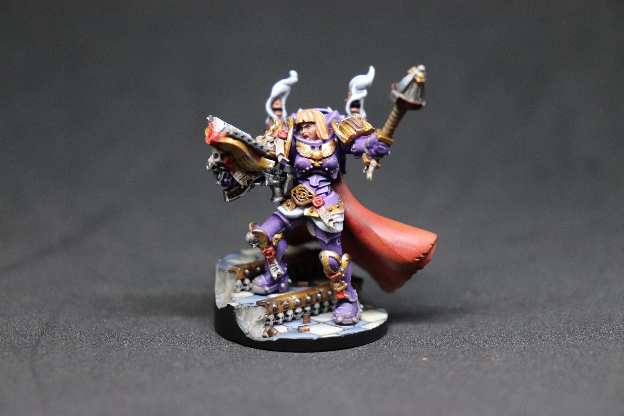 La Hermana Marina porta una maza-incensario de energía y un bólter-libro que reparte a la vez justicia y conocimiento.
