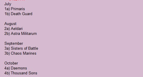 Los de Julio son los lógicos (Primaris y Guardia de la Muerte), y por otro lado, tanto en el Warhammer Fest como en la UK Games Expo desde GW se informó de que saldrían bastantes Codex este año en un calendario relativamente agresivo. Así que aun teniendo que poner en duda cualquier información sin una fuente sólida, lo cierto es que es este calendario no es descabellado.