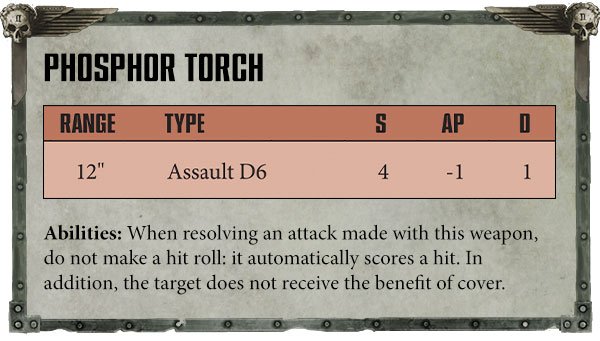 Los otros Pteraxii, los Sterylizors, llevan lanzallamas con FP-1 que ignoran cobertura, como los de los perros-caballo, pero son Asalto y de alcance 12″ por lo que podrán usarlos desde despliegue rápido: