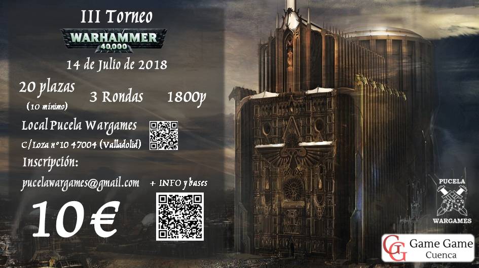 El mismo día, 14 de julio, los amigos de Pucela Wargames estarán disfrutando de su III Torneo 40k, otro torneo de 1800 puntos, una cifra que cada vez se extiende más. Si no os habéis apuntado, todavía estáis a tiempo.