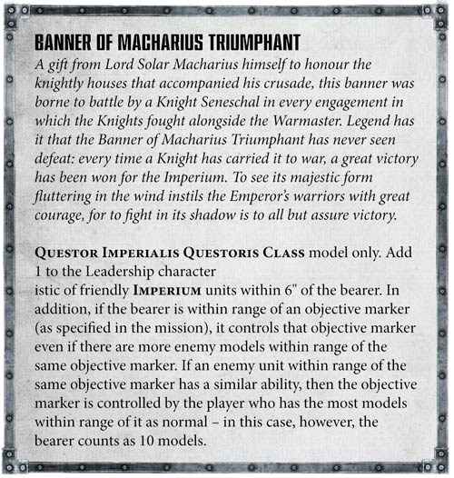 Hay una impresionante cifra de 22 artefactos para personalizar al máximo los ejércitos de Caballeros Imperiales. Veamos varios ejemplos: