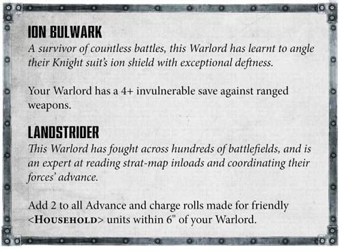 La regla de Personajes para los Caballeros Imperiales es muy curiosa: una miniatura de cada Destacamento Super-Pesado del ejército puede ser denominado Personaje. Y uno de esos Personajes puede ser nombrado Señor de la Guerra. En total hay 15 rasgos de Señor de la Guerra, entre los exclusivos de las Casas y los genéricos. Veamos algunos de ellos: