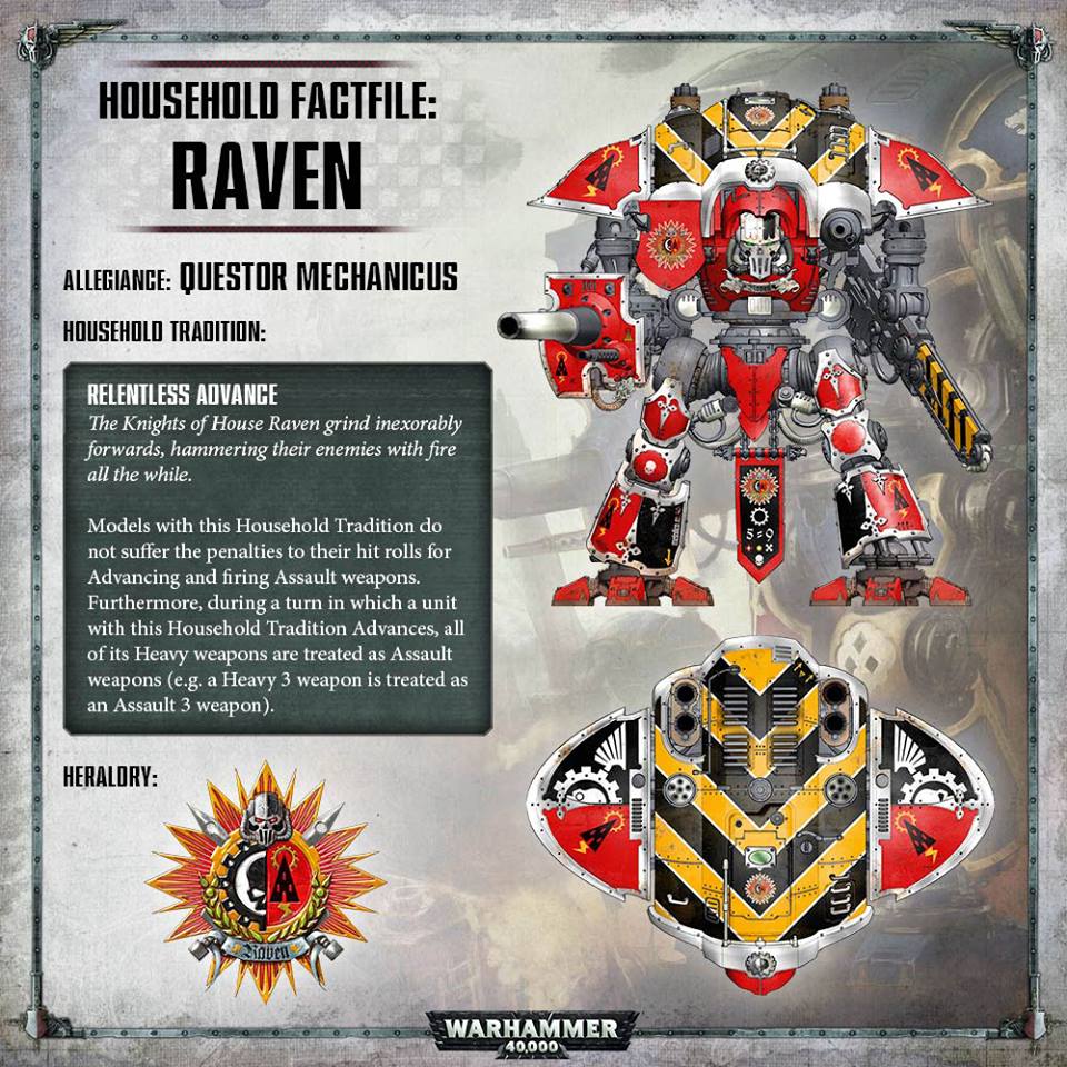 Algo que agradecerán los jugadores del Adeptus Mechanicus es que el nuevo Codex: Caballeros Imperiales incluye reglas concretas para el Questor Mechanicus, como por ejemplo la Casa Raven. Además ya se han filtrado los precios de los nuevos Caballeros y de Renegade.