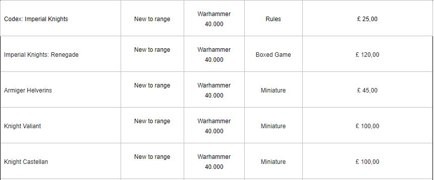 – La caja Renegade, con 2 Caballeros + escenografía, costará unos 160€ (recordemos que cada Caballero suelto cuesta 110€, así que volverá a ser la mejor forma de hacerse un ejército de Caballeros Imperiales).
