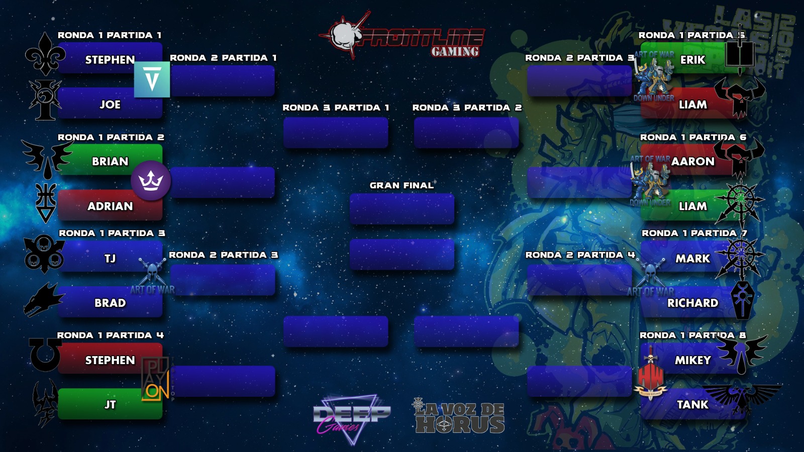 En la primera partida de octavos de final, los Ángeles Sangrientos de Brian Pullen se han enfrentado a los Arlequines de Adrian Phillips. La partida comenzó con la movilidad superior de los Arlequines intentando jugar mejor la misión que los Ángeles Sangrientos. El Judiciar de Brian cayó a las primeras de cambio entre fusión y Death Jester, y en general los Sangrientos jugaron con mucha precaución y sin tener capacidad ni iniciativa en la partida en los dos primeros turnos. Todo apuntaba a una victoria Arlequina, pero desde el turno 3 en adelante los hijos de Sanguinius se arriesgaron a darlo todo y empezaron a tomar toda la mesa ante unos Arlequienes que prefirieron jugar de manera conservadora y evitar la interacción con sus enemigos. Cuando Adrian quiso darse cuenta, la valentía final de Brian lo había superado en una partida espectacular y emocionante.