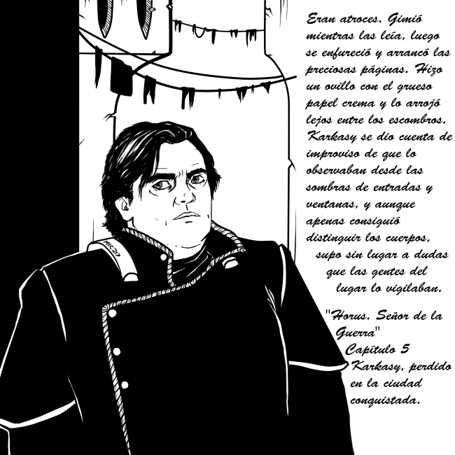 Y es que la Herejía de Horus es una saga que nos trae a la Marina más seria y hasta melancólica en sus dibujos. Os dejamos con ellos, que en esta ocasión son el rememorador Karkasy y el Capitán Tarik Torgaddon de los Lobos Lunares: