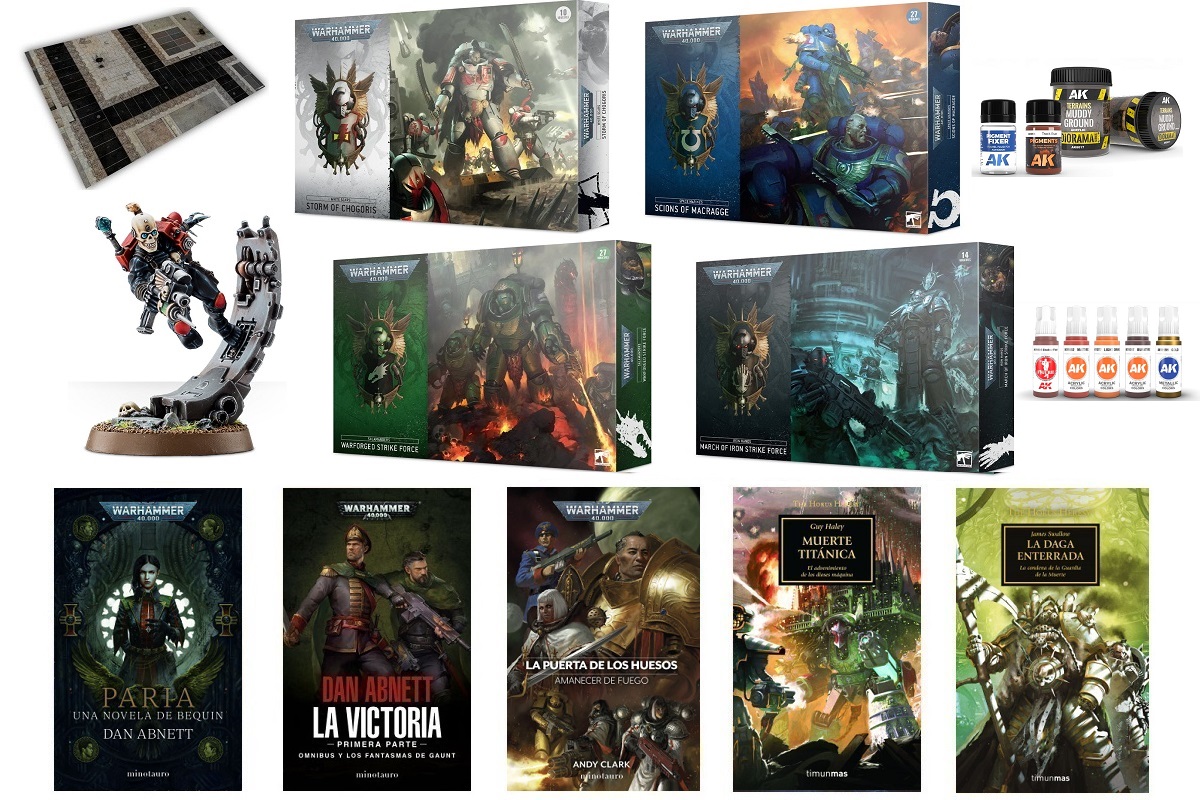 Gracias al patrocinio de Minotauro-TimunMas es posible ofrecer un pack de novelas en formato físico por valor de 100€. El ganador podrá seleccionar las novelas de entre las que tienen en su catálogo destinado a la Black Library en español. Por ejemplo, un posible pack sería el siguiente:
