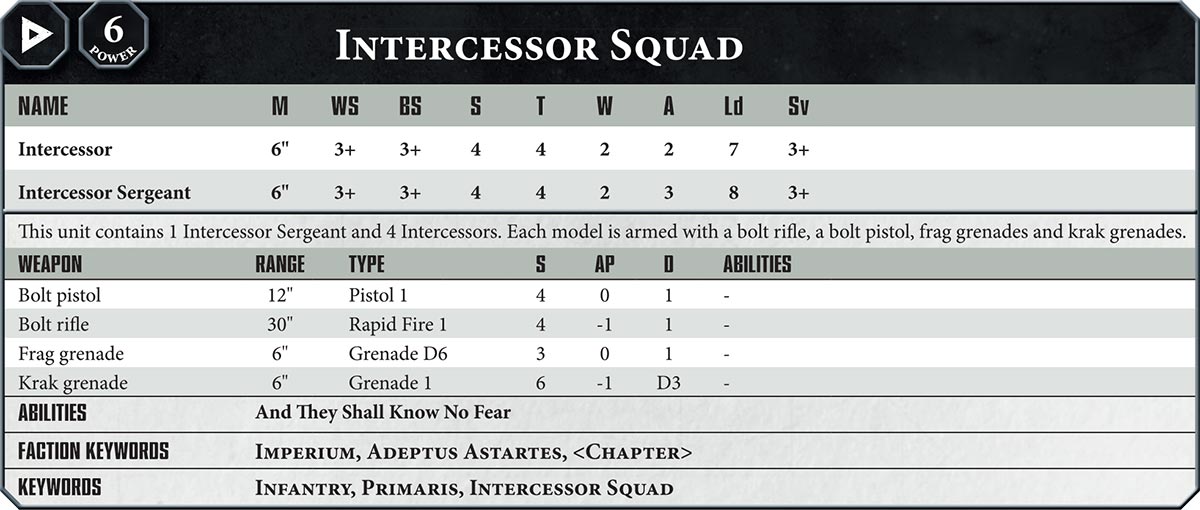 La hoja de datos de los Marines Espaciales Primaris (escuadra de Intercesores)