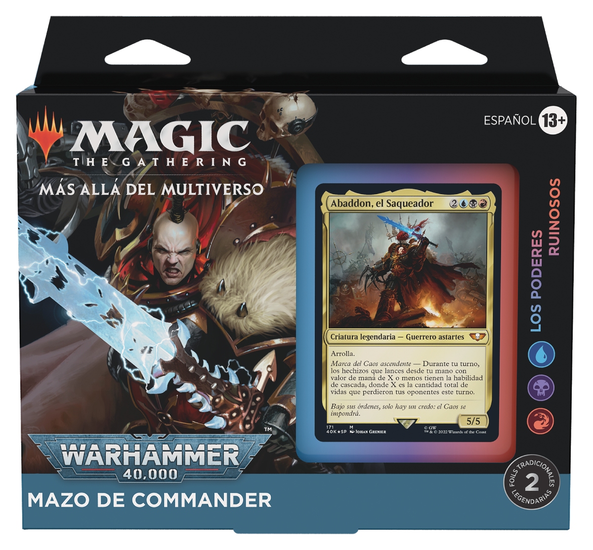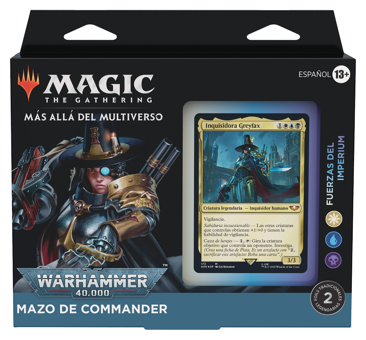 La unión de estos dos titanes ha dado paso a la publicación de 4 nuevas barajas de Commander, un modo de juego de Magic: The Gathering diseñado para partidas de hasta 4 jugadores, con mazos de 100 cartas entre las que una de ellas es tu Comandante. El Comandante es un gran personaje de Warhammer 40k, y las barajas son facciones icónicas del lejano y siniestro futuro donde sólo hay guerra: