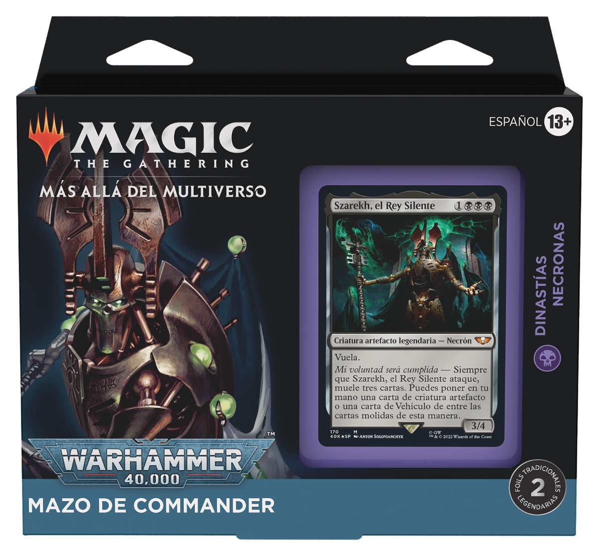 - Dinastías Necronas, con un ejército temático más cohesionado que ningún otro mazo de esta colección. Los Necrones son legión, y sus líderes son el inefable Szarekh, el Rey Silente, o el hábil Imotekh, Señor de la Tormenta.
