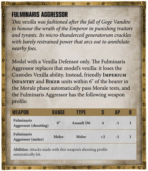 Poco hay de interés que no se supiera ya, aunque quizá una de las reliquias que más efecto puedan tener en ejércitos imperiales en general es el estandarte Fulminaris Aggresor, aplicable a Pretores Vexilus que lleven una Vexilla Defensor, que se intercambia por este estandarte que permite ignorar Moral en aura de 6″ a unidades imperiales de todo tipo de Infantería y Motoristas, además de ser un lanzallamas de FP-1 y un arma de cuerpo a cuerpo:
