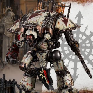 El Desecrator es la versión caótica del Preceptor, dado que tiene un aura idéntica a la imperial de 6″ de repetir 1s al impactar con Perros de Guerra (los Armigers caóticos, o como nos gusta llamarlos a partir de hoy, los Enermigers). Además por fin conocemos el perfil de su arma láser:
