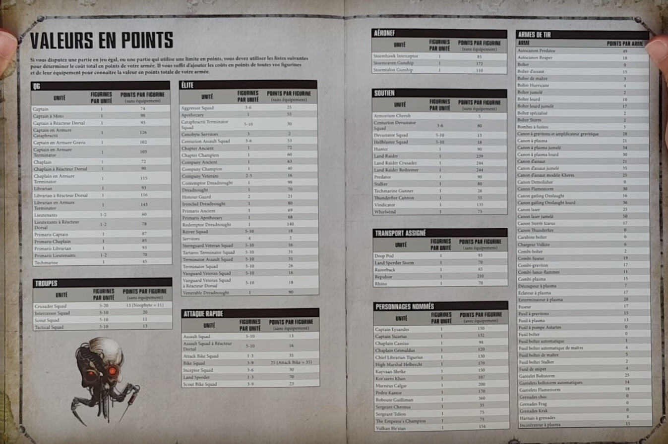 El vídeo está en francés, aunque las políticas de nombres de las unidades en inglés de GW tienen un inesperado lado positivo: es posible ver el Codex en francés y entender qué unidad es cuál. En todo caso, lo interesante es la tabla de puntos, que tiene los cambios mencionados ayer como las motos a 25pts en vez de a 31pts, etc: