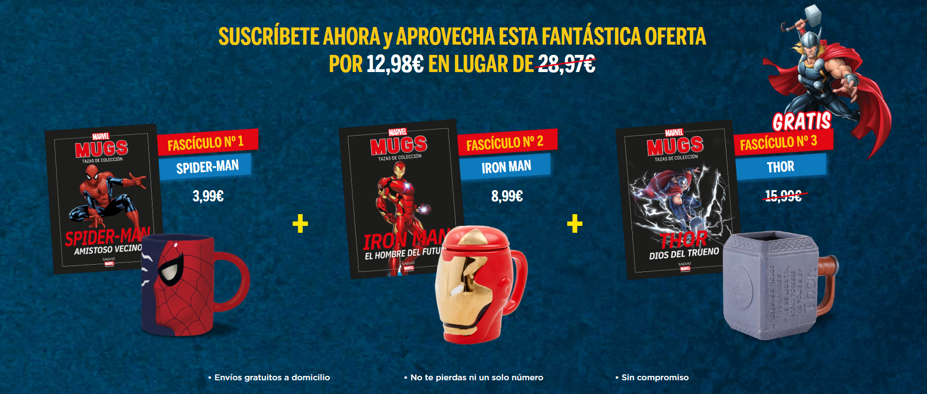 Es decir, en las primeras semanas es posible conseguir estas 3 tazas de loza de colección con detalles en 3D junto a contenido adicional como una introducción a los héroes, universo, lista de lectura y detalles de las tazas. Pero ojo, porque además está la oferta de suscripción desde su web. Si te suscribes a partir de la primera entrega, obtendrás estas tres primeras entregas por sólo 12,98€ (el precio en quiosco sería de 28,97€). ¡Con envíos gratuitos a domicilio!