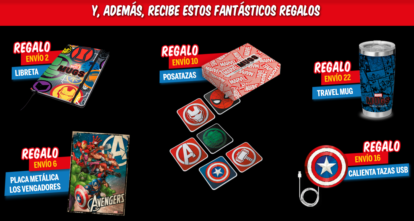 En resumen, una libreta exclusiva, una placa metálica de Los Vengadores, una colección de posatazas, un calienta tazas USB y un travel mug. Todo eso… ¡gratis por suscribirte! ¿Y hemos dicho ya que toda la colección completa tiene gastos de envío gratis?
