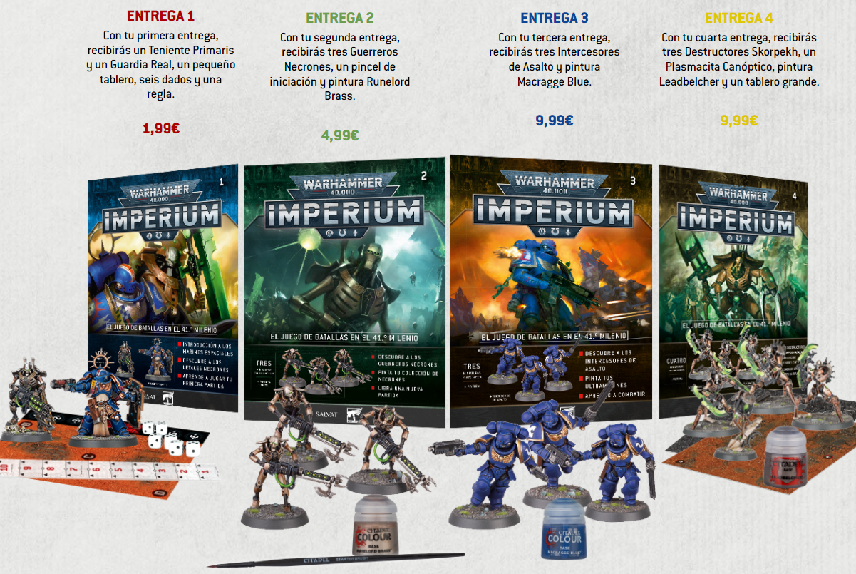 Así que se trata de una colección que arranca esta semana y tendrá una entrega cada semana en quioscos y tiendas con contenido de Warhammer 40.000. Miniaturas, escenografía, pinceles y pintura serán los protagonistas de esta colección de 80 entregas. Y además ya te puedes suscribir para no perderte ningún número. En ese caso, cada mes se recibe un paquete con las 4 entregas del mes juntas (en el caso de los 3 primeros envíos, son 2-3 entregas cada uno dependiendo de la entrega en que te hayas suscrito).