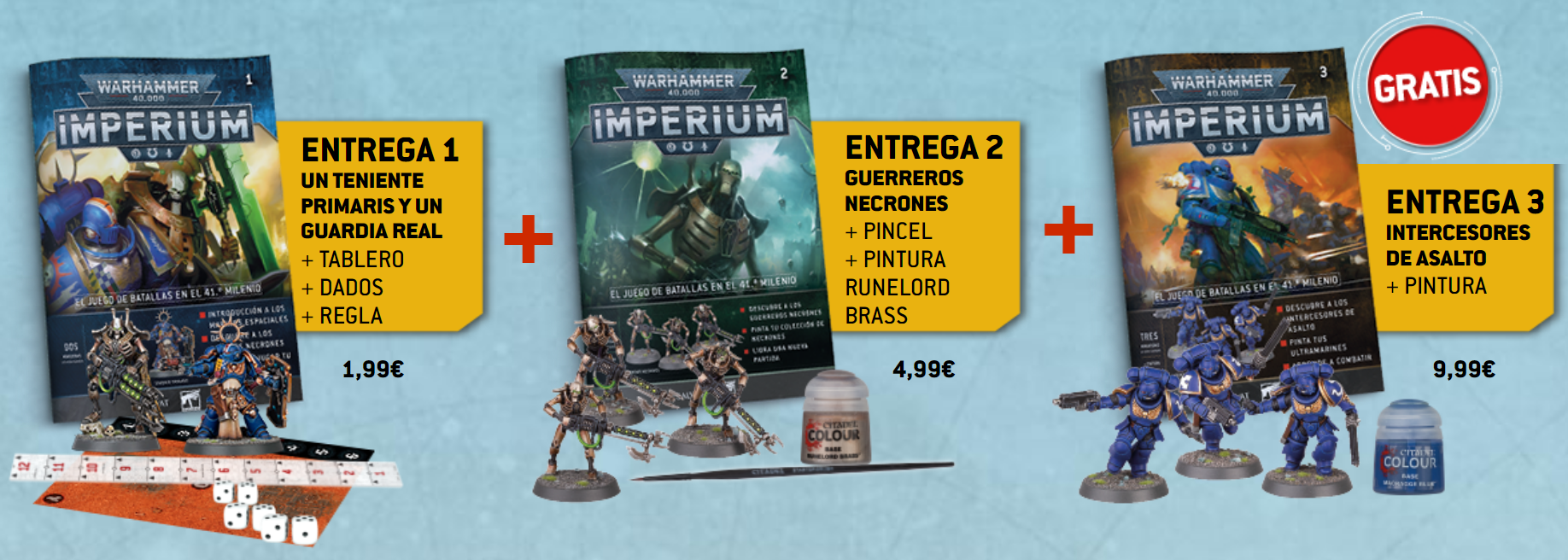Es decir, en estas pocas entregas ya es posible conseguir un personaje Necrón, un personaje Primaris, 3 Guerreros Necrones, 3 Intercesores de Asalto, 3 Destructores Skorpekh con Plasmacita Canóptico, un pincel, 3 botes variados de pinturas, 2 tableros y 6 dados.