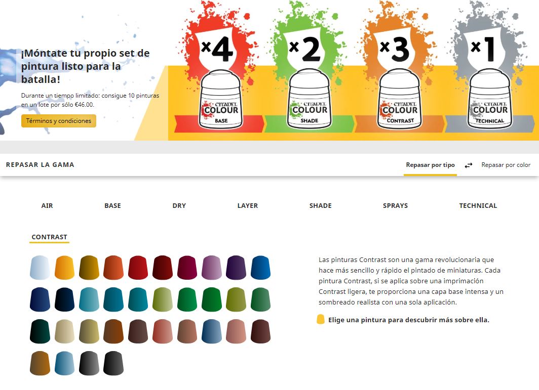 Todos estos prepedidos son para entrega el próximo sábado 15 de junio, que es la fecha de lanzamiento. La web de GW ya tiene un configurador hecho especialmente para crear los sets de 4 pinturas Base, 3 Contrast, 2 Shade y 1 Technical: