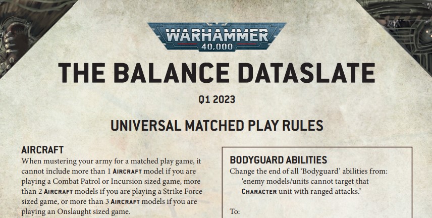 Con respecto a la Balance Dataslate, muchos cambios afectan a las diversas facciones del juego y a algunas reglas generales en juego equilibrado.